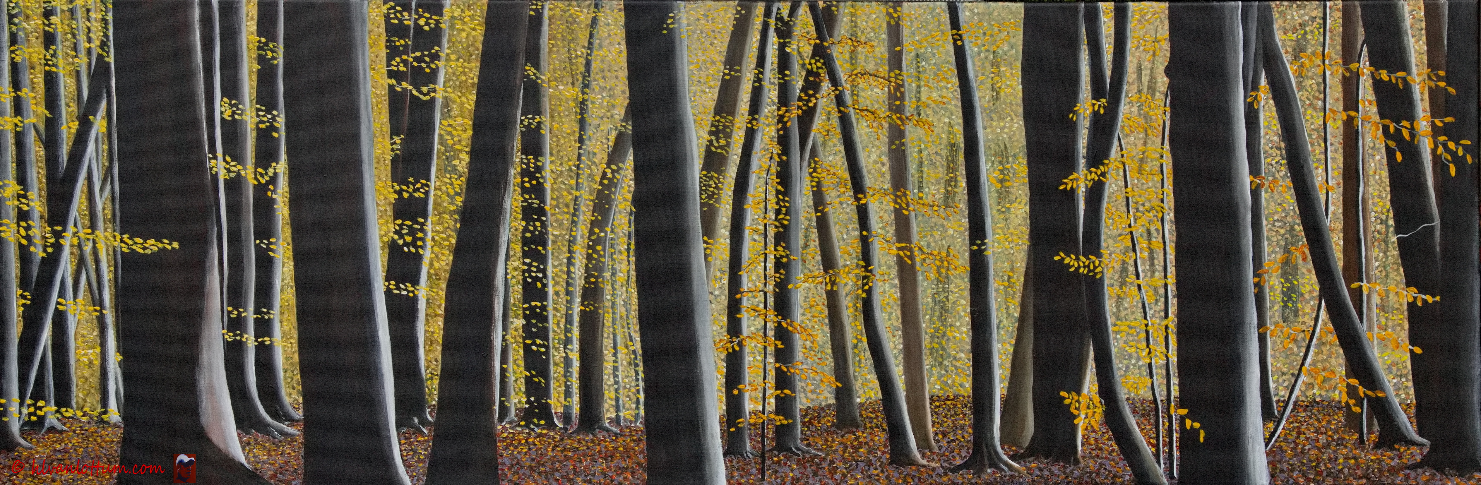 Tot nu toe had ik een bos met vooral grote beukenbomen geschilderd daarom wilde ik het dit keer een bos met meer kleine bomen schilderen, een wat drukker beeld>