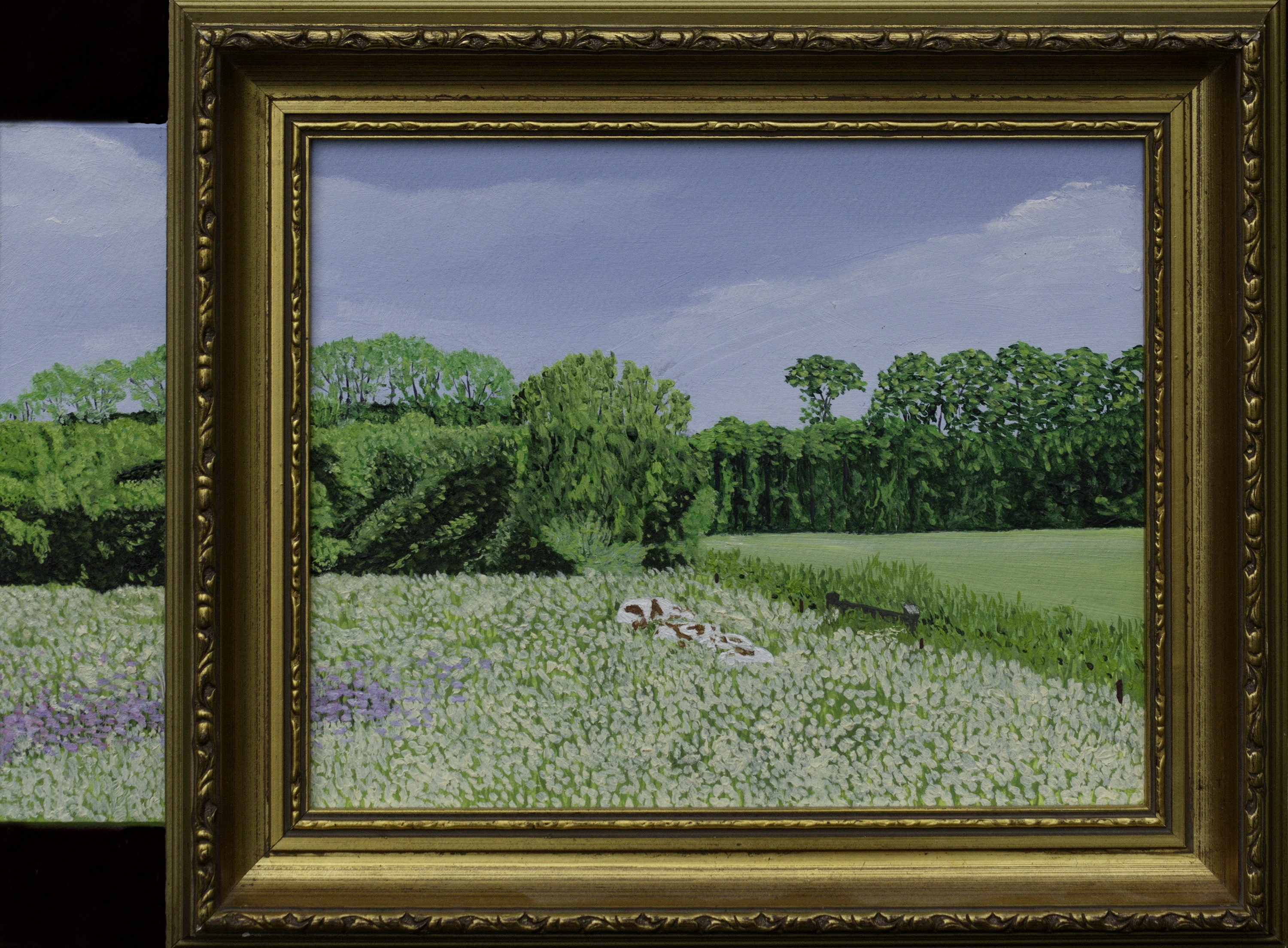 Dit schilderij, landschap bij huis Dorth, heb ik al eerder op mijn blog geplaatst. Maar toen alleen het schilderijtje met de lijst. Omdat het schilderijtje niet in de lijst paste heb ik er een stuk afgesneden, is geschilderd op passe-partout karton. Ik had altijd het idee om het afgesneden deel de lijst vast te maken zodat het lijkt dat schilderijtje door de lijst heen loopt.