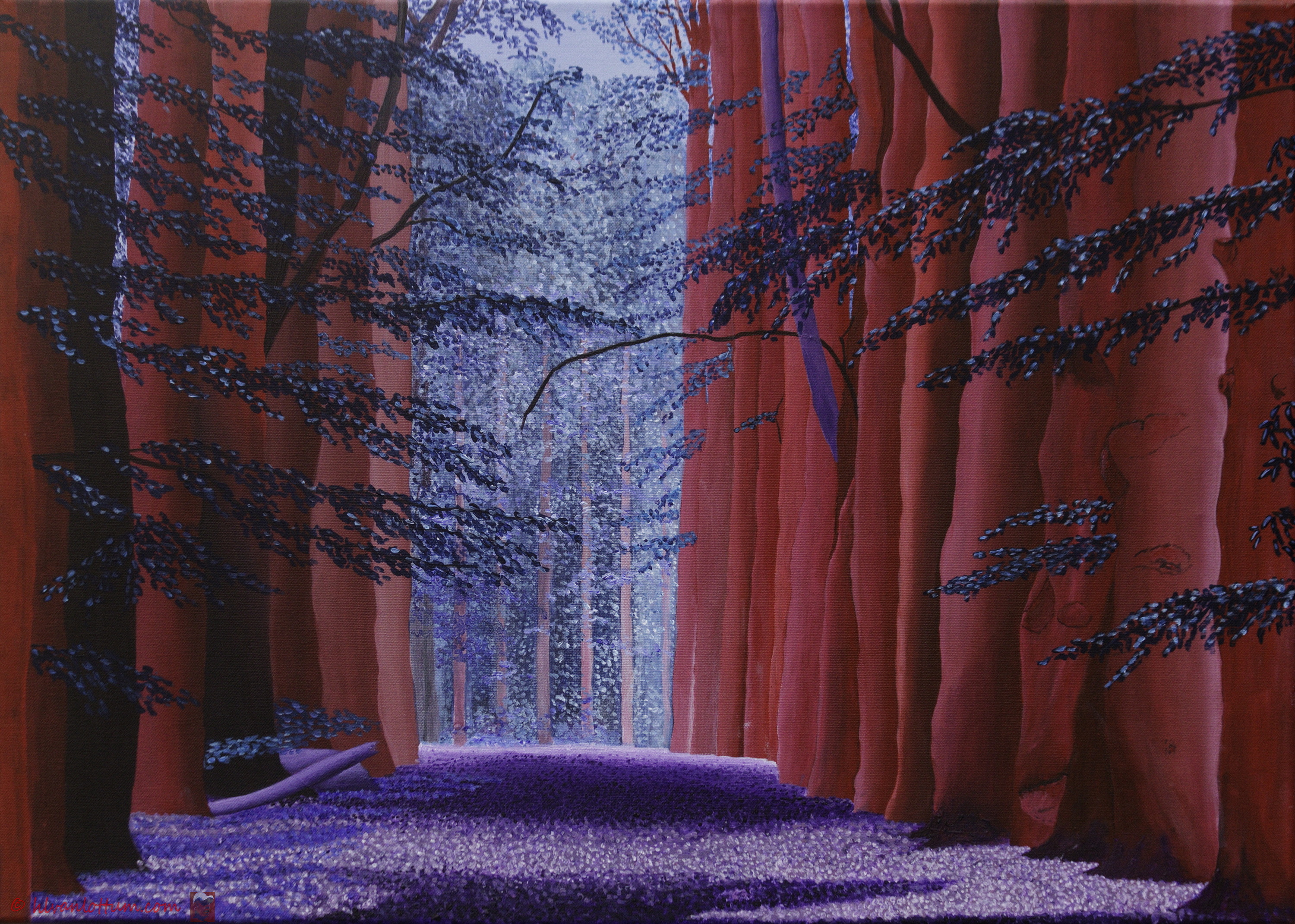 Ik besloot het niet in de vale bruine kleur die de stronk had te schilderen maar in paarse tinten. Ik kan niet zeggen waarom dat zo moest zijn.