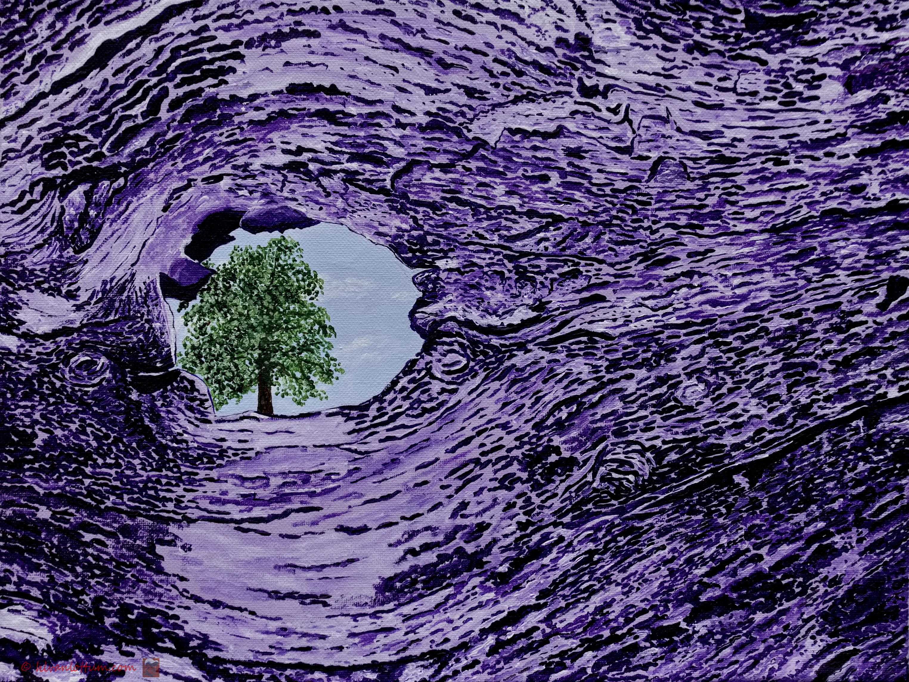 Het begon met het schilderen van een deel van een oude, en dode boomstronk. De levende schors was weg en wat restte waren droge ribbels en brokken dode schors. In het midden zat een gat waaruit een restant van een tak uitstak.