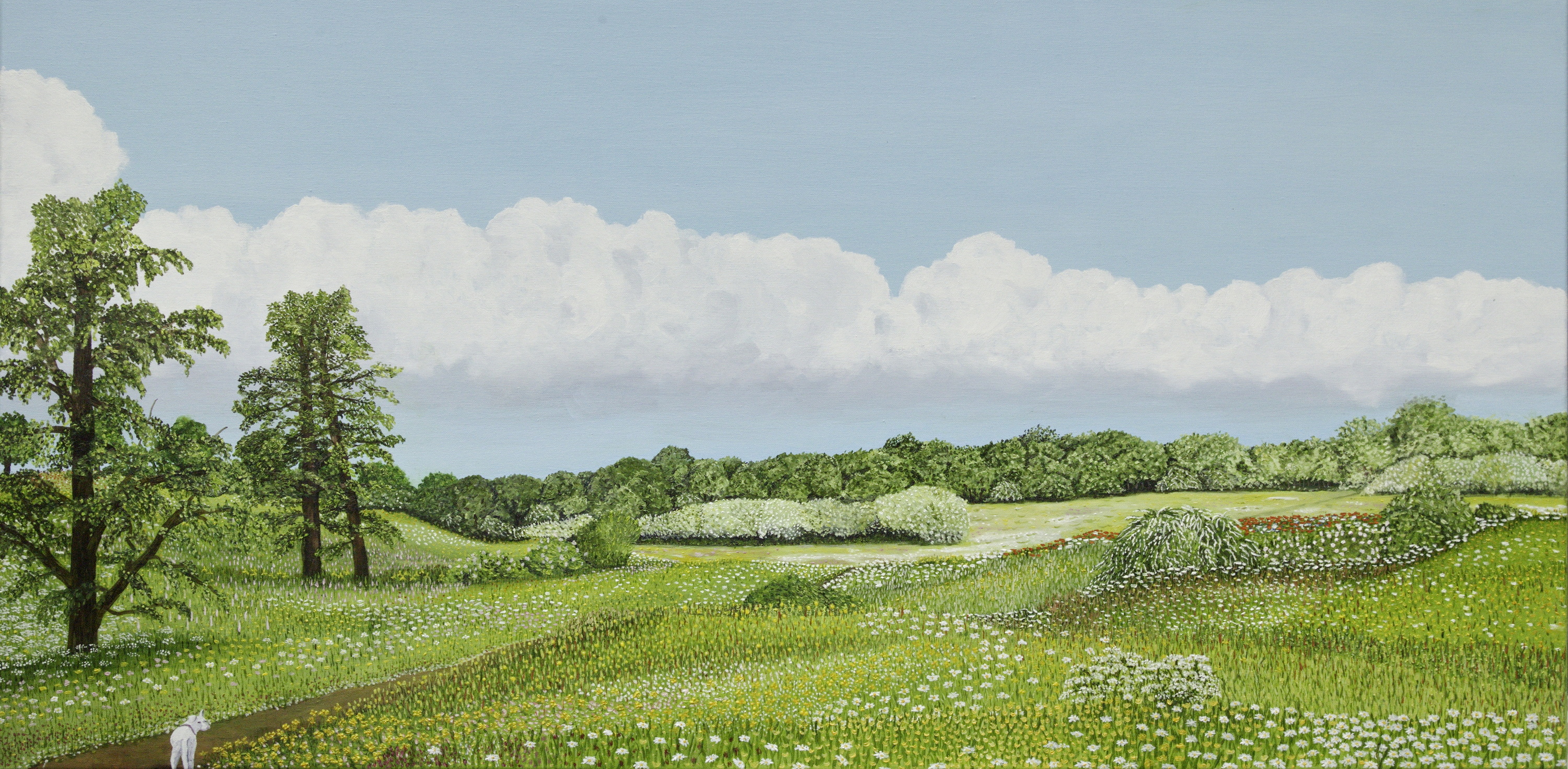 Geïnspireerd door het kleine schilderij “Pad door het dal” van de Russische schilder Ilja Repin wilde ik een schilderij maken dat de bloeiende uitbundigheid van de natuur laat zien in een landschap waar diepte en ruimtelijkheid ervaren wordt, en dat heeft mij tot dit schilderij gebracht.