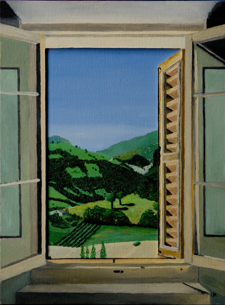 Het idee voor het Italiaans uitzicht is om een soort 3-D schilderij te maken waarbij het landschap, dat door het venster te zien is, verwisselbaar is.