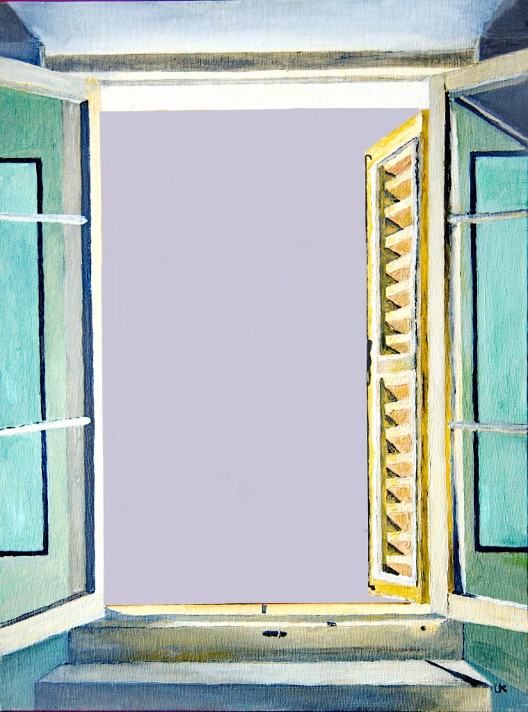 Dat betekent dat ik het landschap dat origineel te zien is uit het karton gesneden heb. Er is dus een schilderij gemaakt van alleen het venster, zie onder.